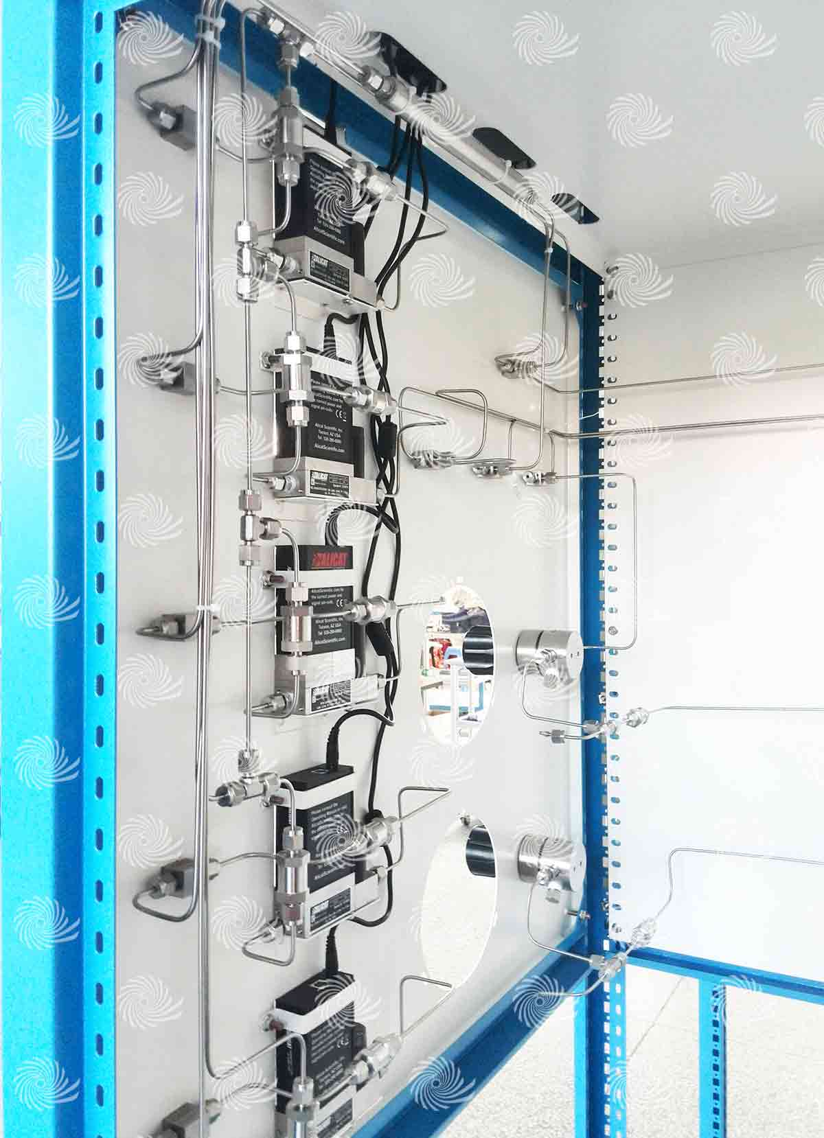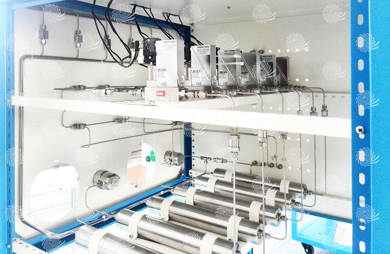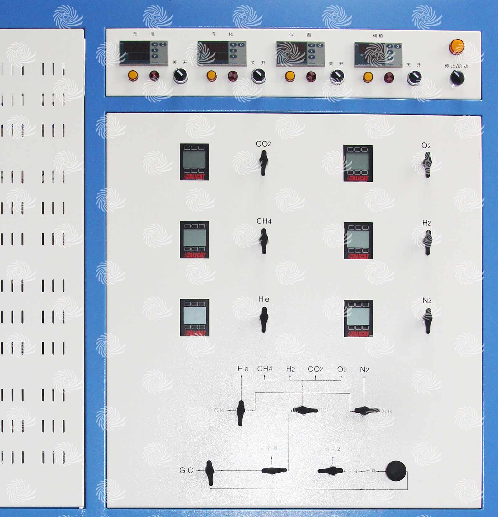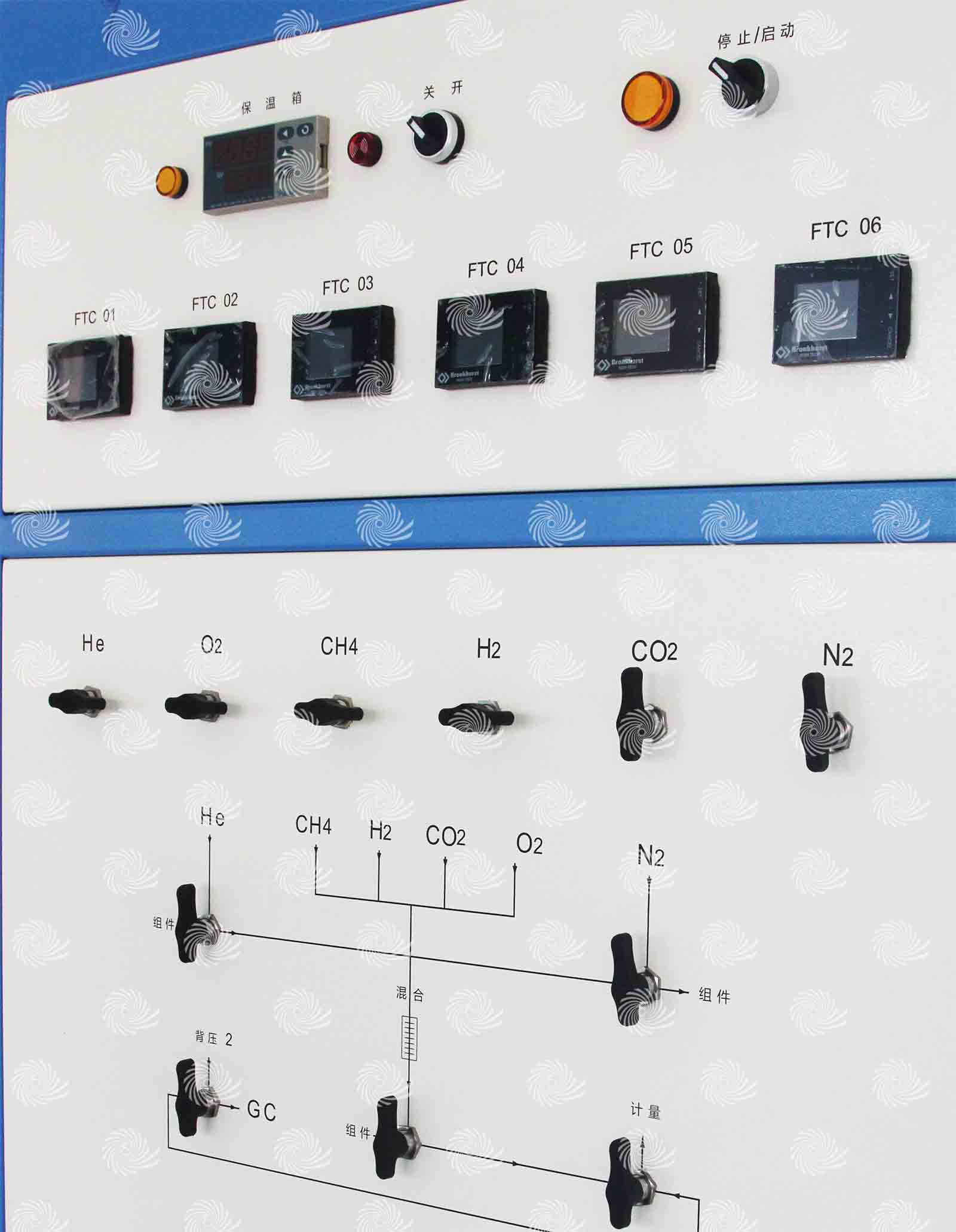 控制部分下方放置色谱。实验气体经过公用管道进入装置,使用球阀控制气体开关。经过滤、流量控制,混合后进入控温箱中的膜组件。膜组件带有加热或制冷装置控制温度。尾气与色谱连接。