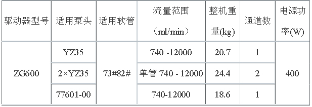 ▲可安装泵头:YZ35、77601-00泵头,能提供740-12000ml/min(单管)的流量范围;转速手动调节,亦可通过外控接口进行控制;采用大功率直流电机驱动,动力强劲,扭矩大,可以驱动双泵头。适合工业场合较大压力和流量的输送,流量稳定、噪音小、操作简单