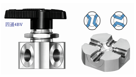 2.手柄箭头所指方向及反向的两对接口是连通的,二垂直手柄方向的流路并不连通